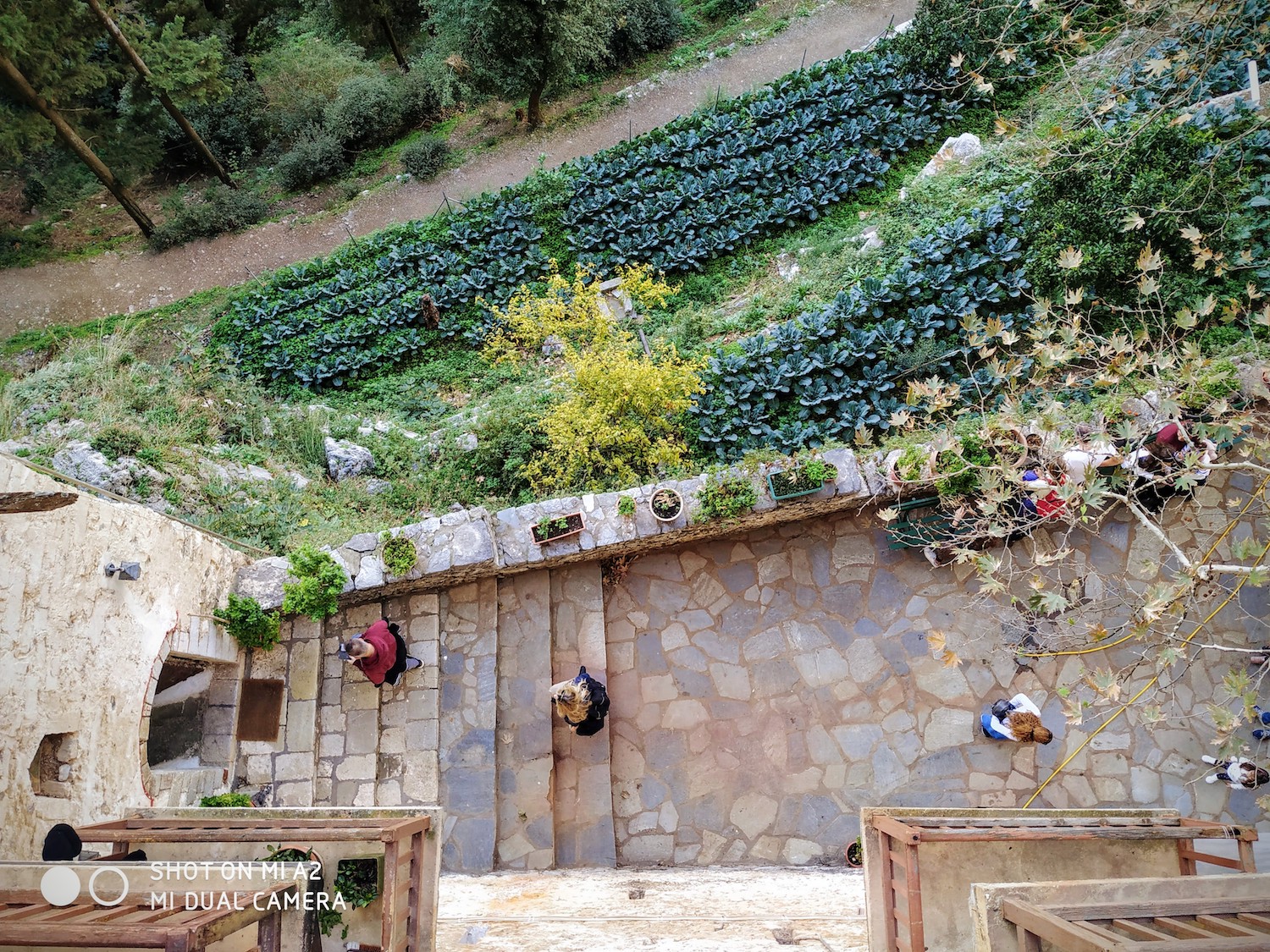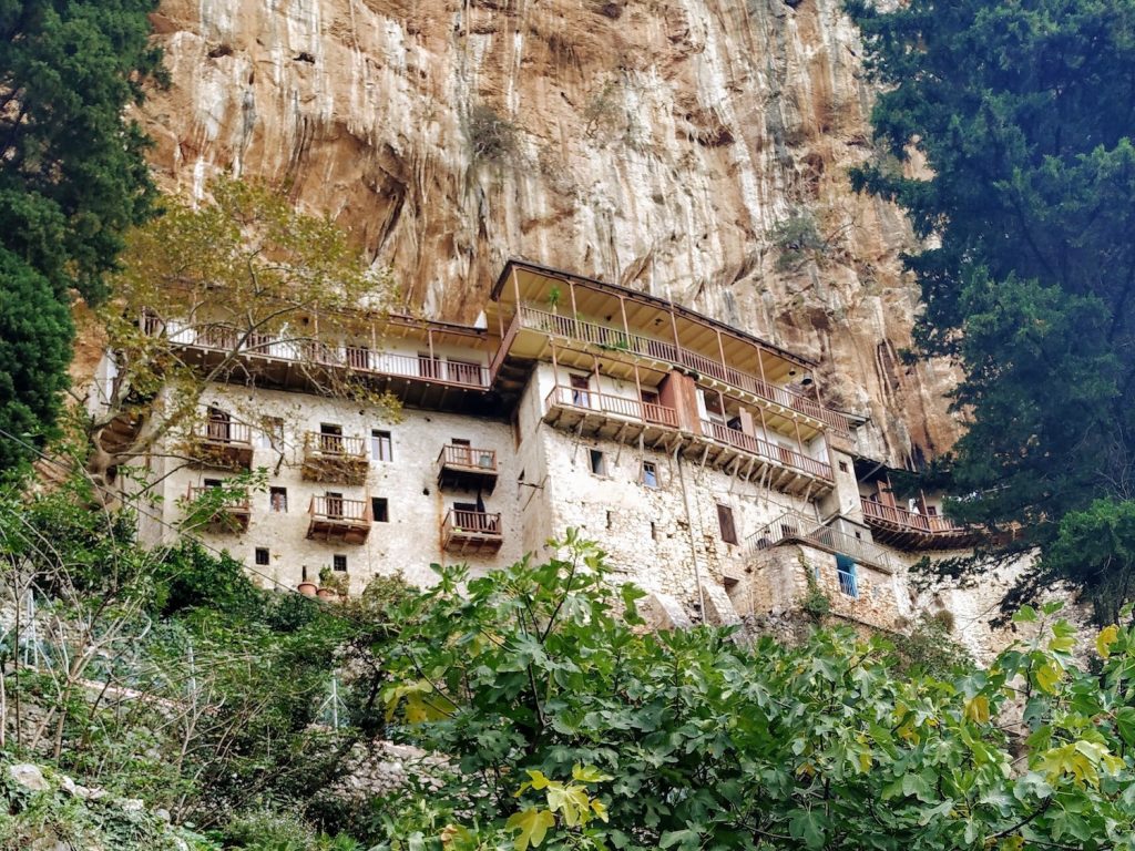 To approach Prodromos Monastery we had to descend to the bank of the river and cross it by using a bridge. Of course whatever goes down must come up! So after the steep downhill we had to climb up again. The view and the monastery were outstanding and rewarded our efforts. Built on a huge vertical rock inside Lousios river gorge is one of those mad places that only faith can explain.